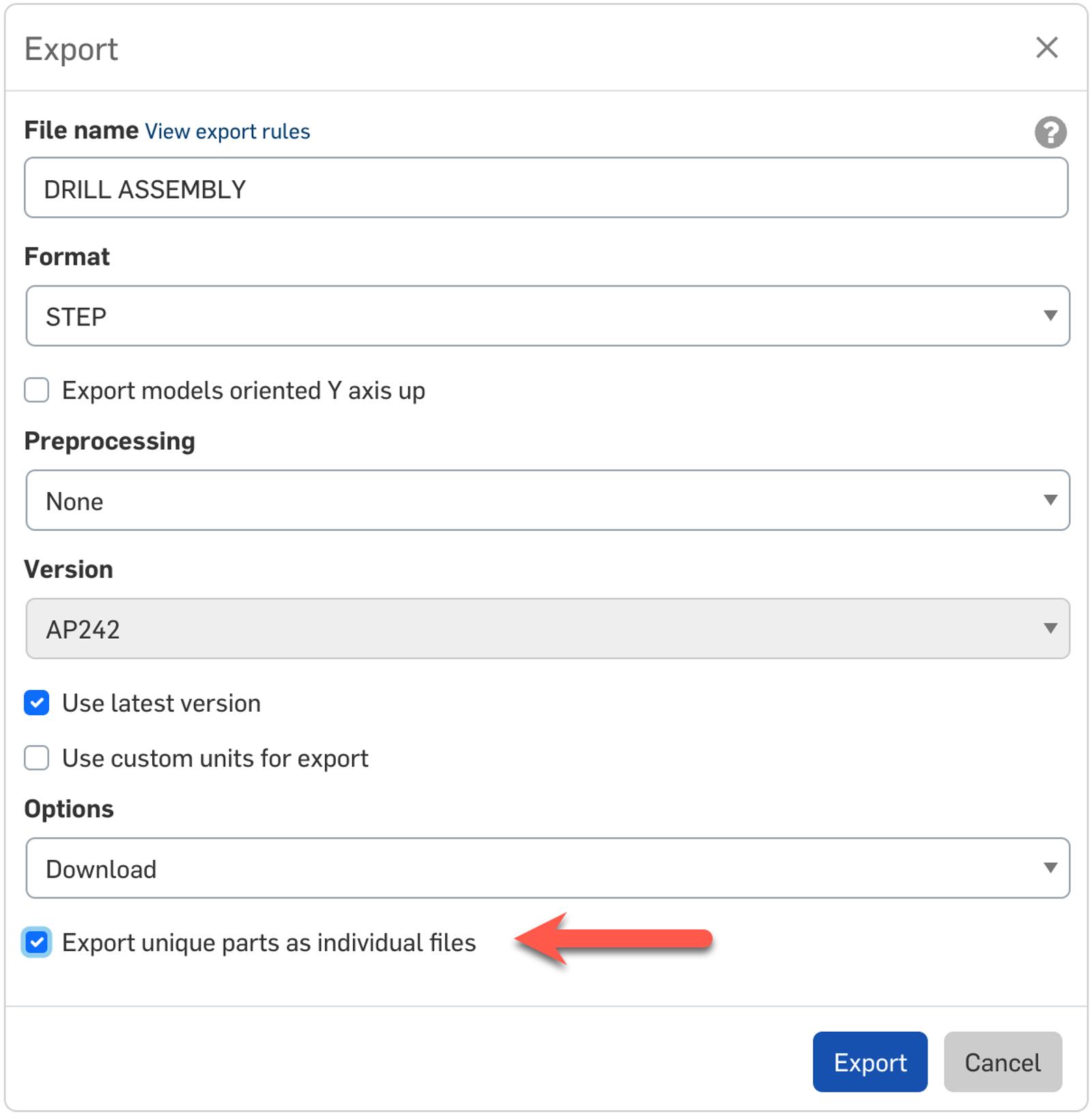 When exporting an Assembly or entire Part Studio, the option to Export unique parts as individual files is now available for any selected file format.