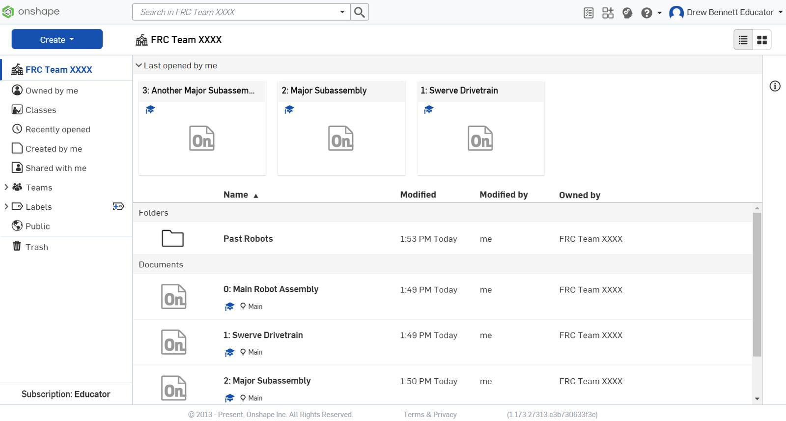 We encourage all mentors and teachers to upgrade to the Educator Plan. There’s no reason not to upgrade – it will not affect your existing documents and will add more capabilities to your Onshape account. However, we recommend that a team-wide email (that is not tied to a specific individual) owns the Classroom that your FIRST team will use. This process is explained in more detail below.
