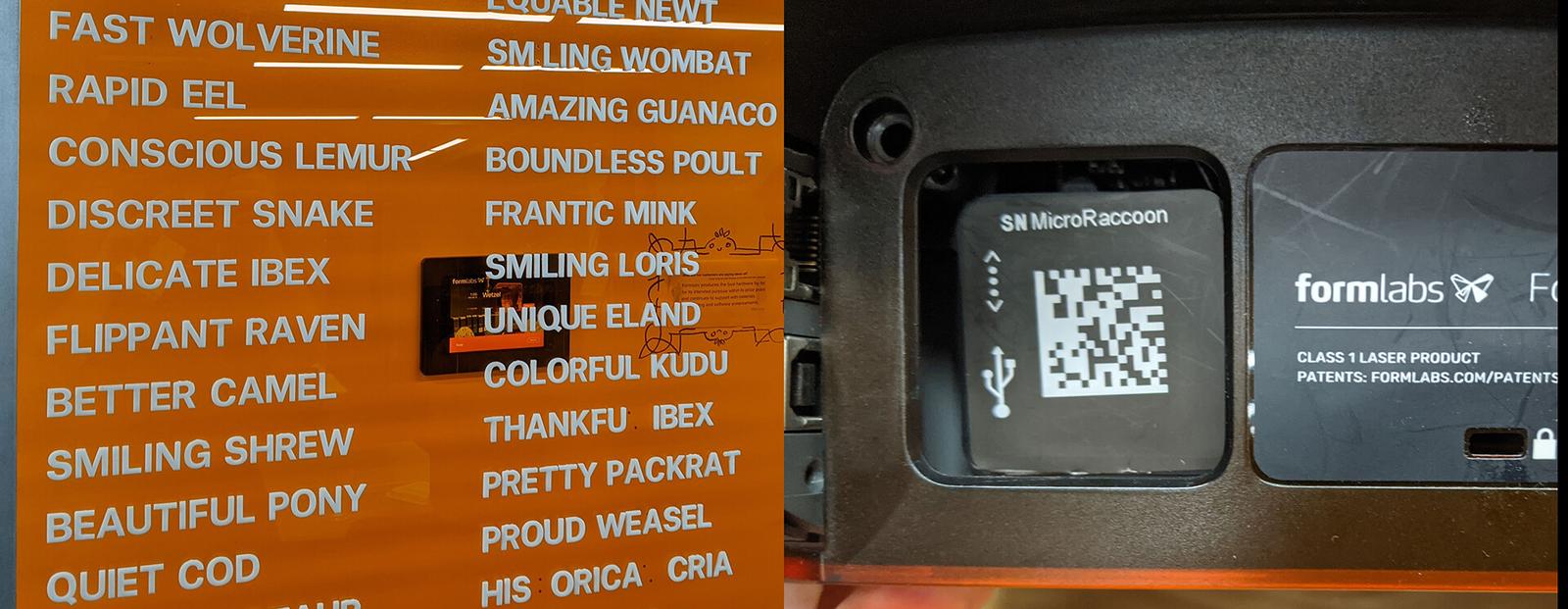 Instead of serial numbers, each Formlabs printer is randomly assigned a nickname containing an adjective and an animal. At left, is a list of whimsical printer names. On the right is a closeup of the back of a printer where users can scan a QR code for technical help.