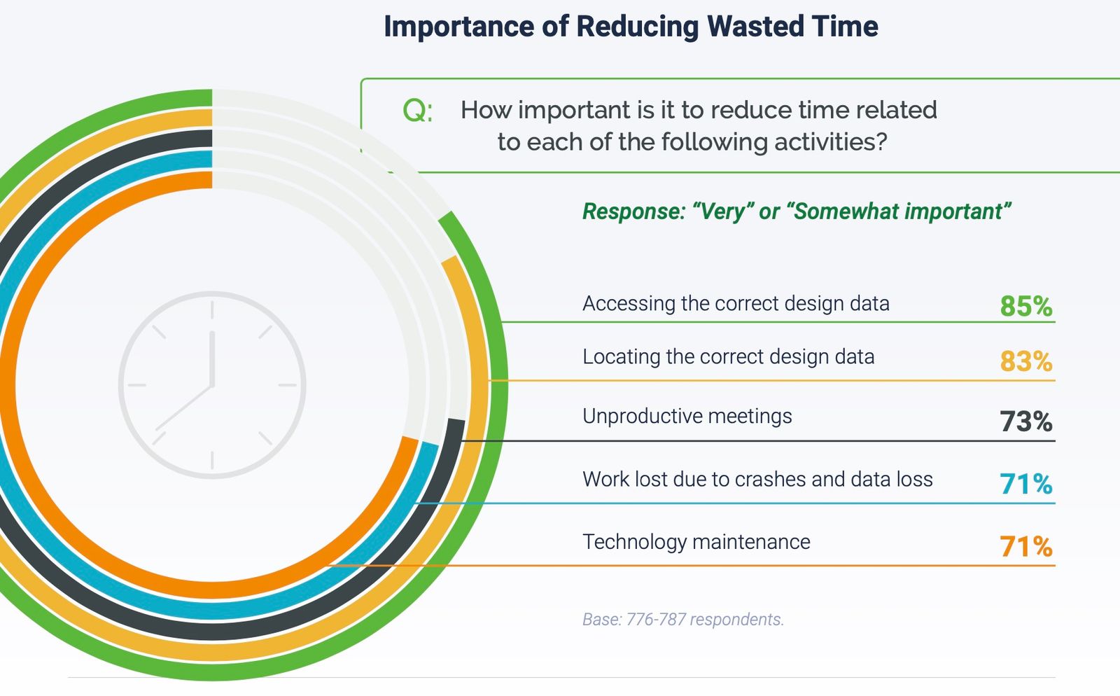 The fact that the data management problems beat out unproductive meetings – everyone’s favorite punching bag – is a notable feat. The engineering field, which places a high value on accuracy and precision, is still struggling with version control and making it easy for multiple contributors in a project to get to the right data.
