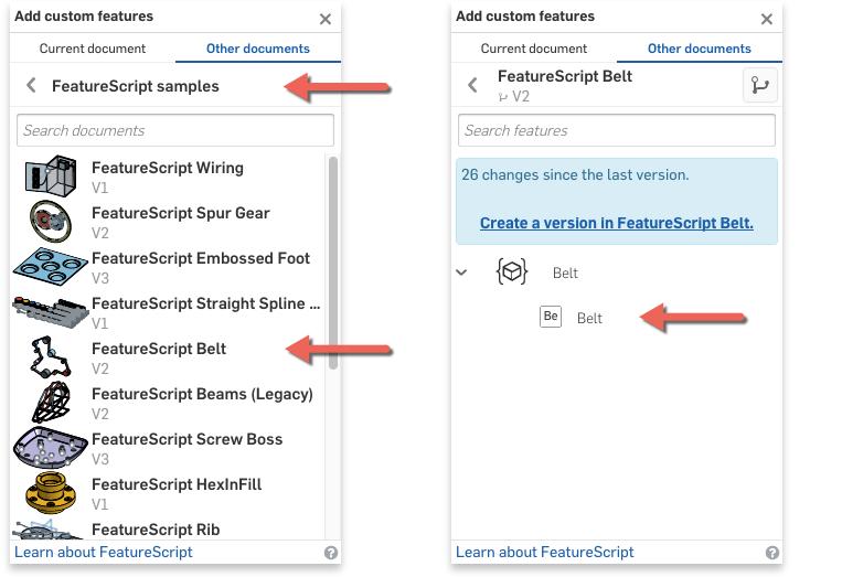 In the “Add custom features” dialog, select the “FeatureScript samples” filter, then “FeatureScript Belt” from the list and then the Belt feature itself. This will add the Belt feature icon to your toolbar and you’ll be able to use it in every Document.