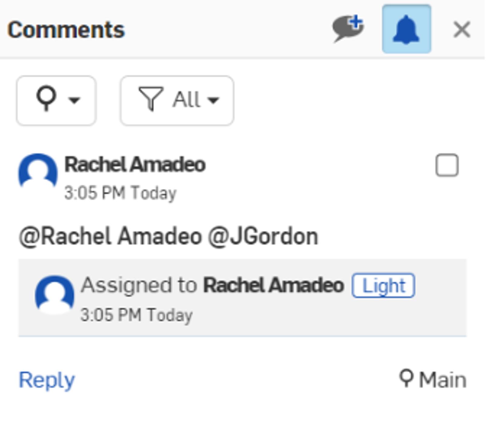 Once a person is tagged in the comment, an Assign to checkbox appears where you can assign a task to other users in Onshape. If there are multiple user mentions in the comment, the first user is shown beneath the comment. Click the dropdown arrow to the right of the user’s name to select another tagged user. Tasks can be assigned to only one user per comment.