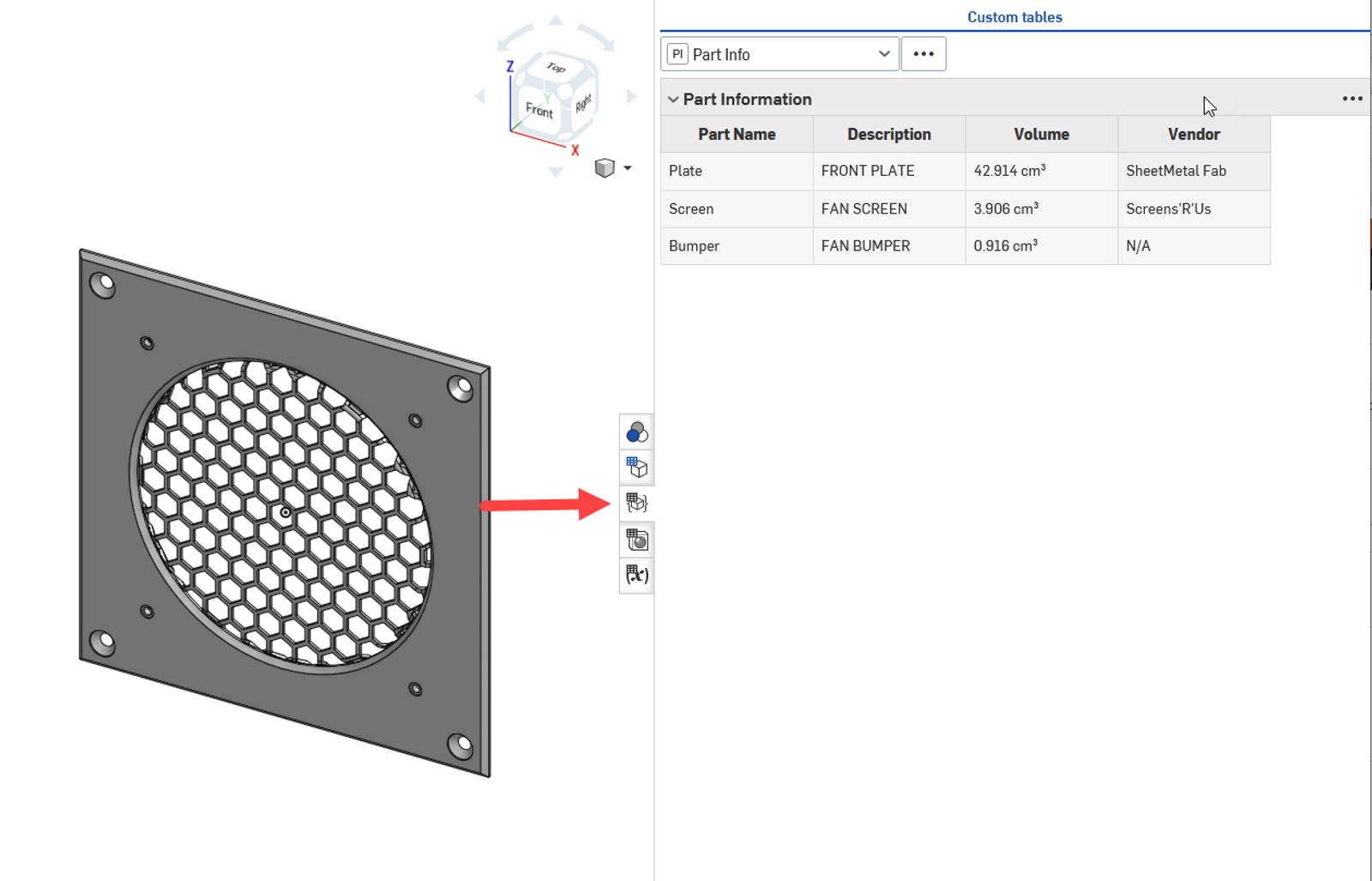 In this Tech Tip, we will build a basic Custom Table to list the part name, description, volume, and vendor for all the parts in a Part Studio.