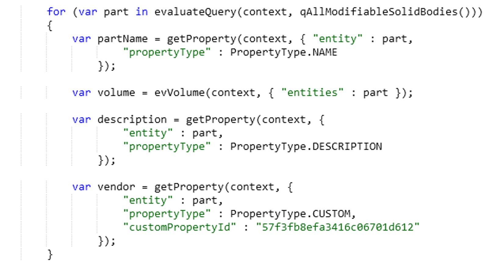 The getProperty function is how you can grab Standard and Custom Properties. For Standard Properties, you only need to define the entity (the part declared in the for loop) and propertyType. Custom Properties require an extra parameter named customPropertyId that you can get inside the properties dialog in the company settings: