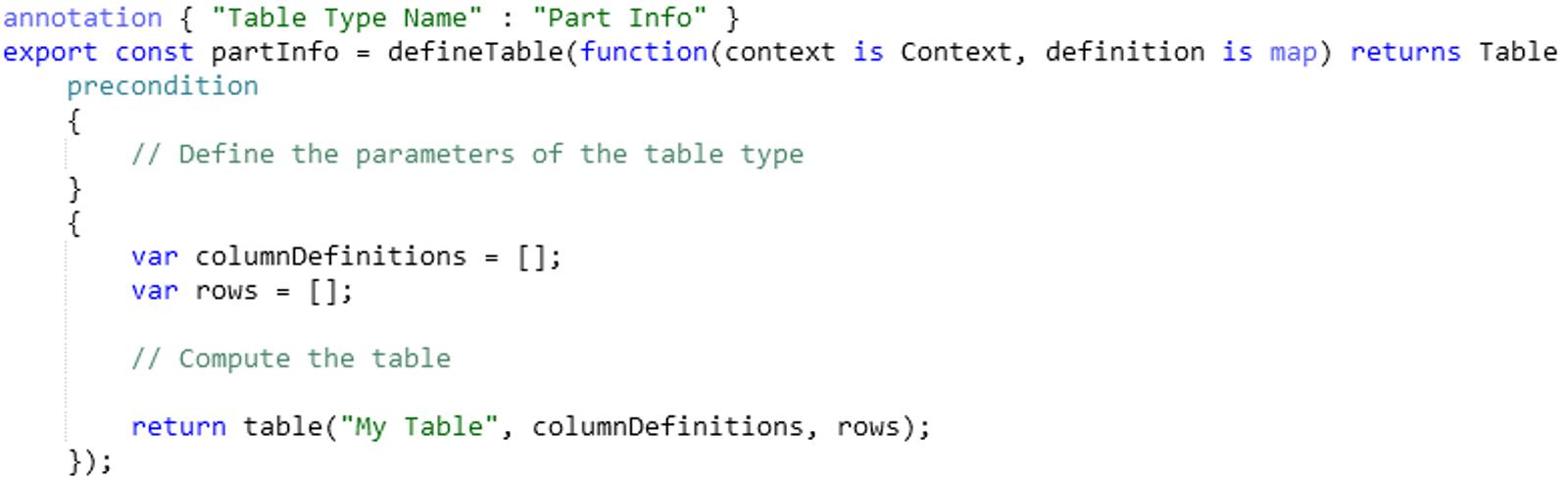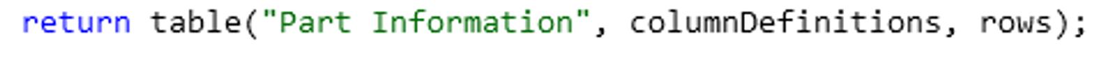 Start typing “define table” and the Feature Studio automatically completes it for you. Name the feature “Part Info”.