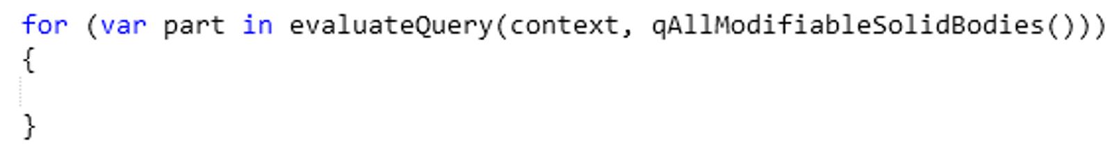 Next, under the array declaration for the rows, define a for loop that will cycle through all the parts in the studio. To do this, use the condition below. More information on queries is located in the Standard Library Documentation.