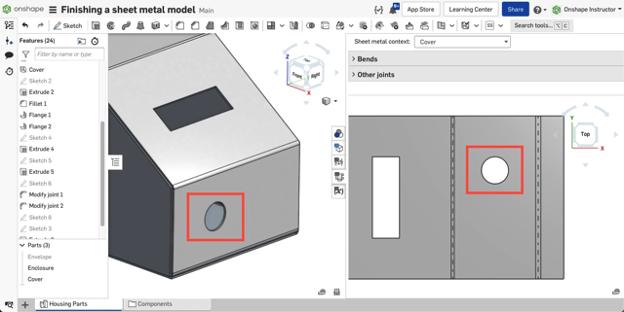 When working with sheet metal, as features are added, the folded and flat views update automatically. Certain features are available and may have limitations such as counterbore and countersink holes.