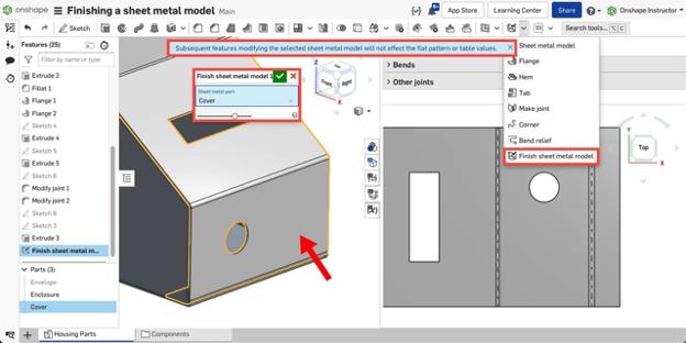 When the Finish Sheet Metal Model feature is applied to a part, all Onshape features except sheet metal are available to use, including features that could create non-manufacturable sheet metal geometry.