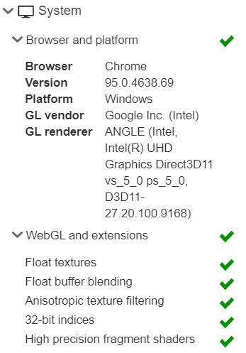 This section is a quick reference for whether or not your system has all the WebGL extensions needed for quality graphics and 3D rendering. If your system doesn’t have all the GL extensions, this should be addressed for best graphics and 3D rendering.