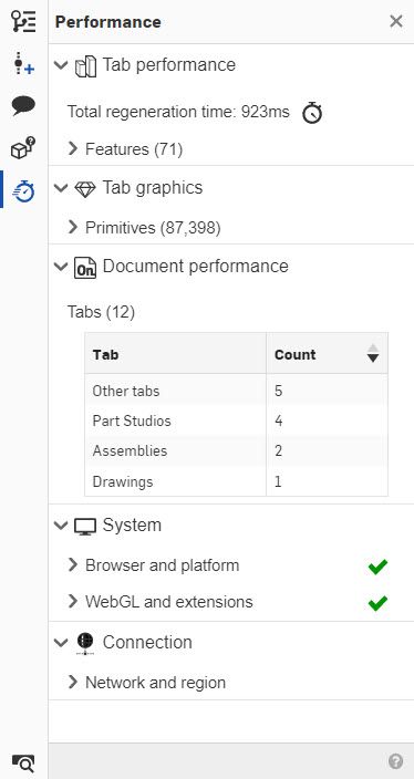 The Onshape Performance Panel is a handy performance analytics tool that provides users with detailed information about items such as their connection, tab graphics, Document performance, Part performance and Assembly performance.