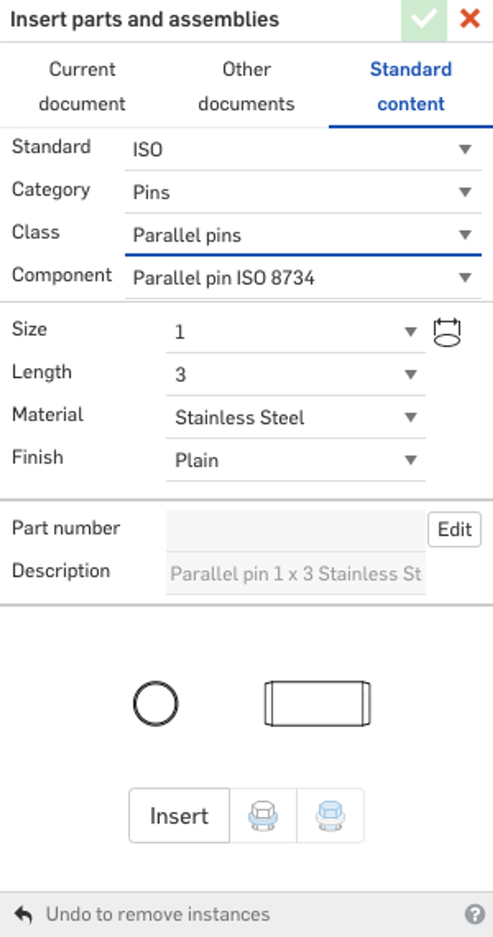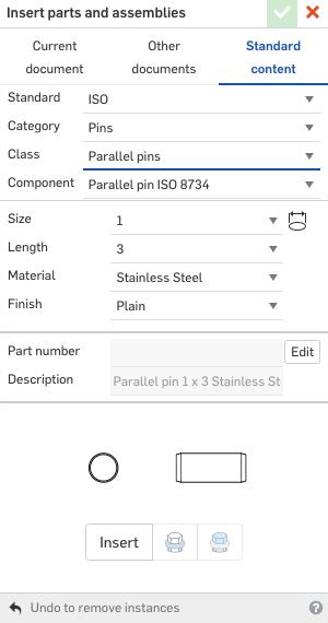 ISO Standard 8734 Parallel Pins have been added to the library of Onshape Standard Content.