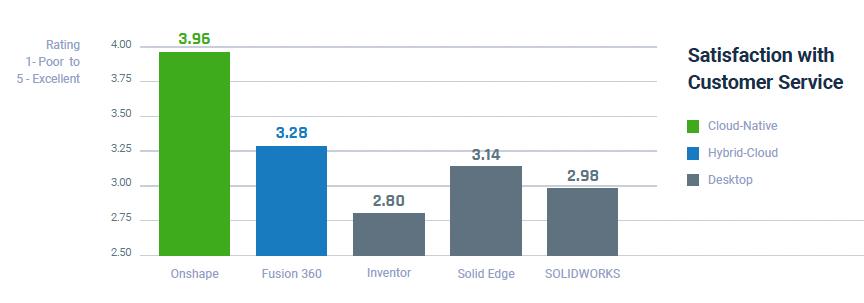 CAD users agree: Onshape’s customer support is superior to other non-cloud-native platforms. According to “The State of Product Design and Hardware Development 2023-2024” report, Onshape scored the highest in customer service satisfaction versus hybrid-cloud and desktop CAD options.