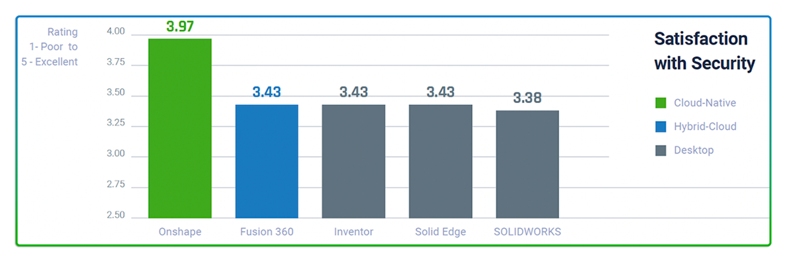 In “The State of Product Development & Hardware Design 2023-2024” report, results from an independent survey of over 1,400 CAD professionals rated Onshape as the top CAD platform for security.