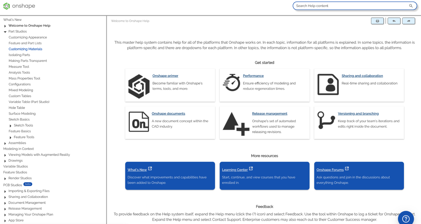 You don’t need to keep bookmarks for various Onshape products or processes. We pride ourselves on accessibility, and part of that is finding the information you need when you need it. Whether it is an intuitive user experience within the product or in our documentation, users have the information they need to do their jobs and the ability to search for and find solutions easily.