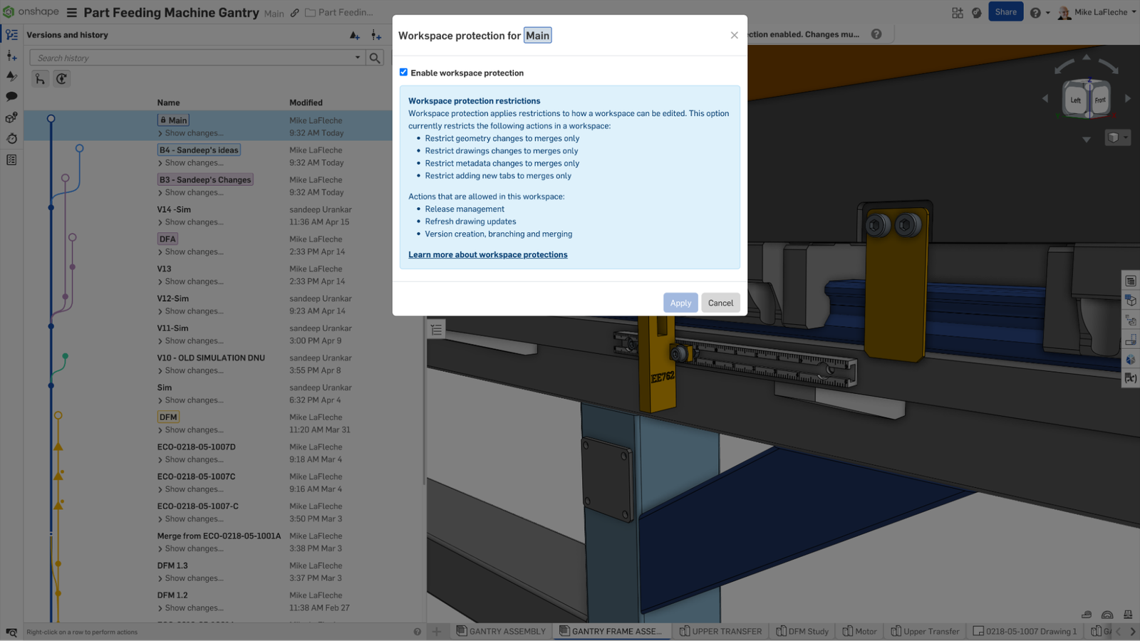 Iteration demands both flexibility and safety. Onshape’s Workspace Protection provides a powerful way to secure your core designs, ensuring your team maintains compliance and avoids accidental changes.