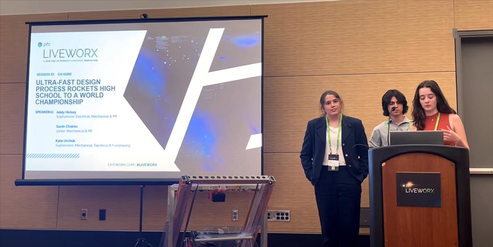 At LiveWorx 2023, three members of the Red Hawk Robotics team – Addy Hickey, Gavin Chaires, and Kate Urchuk – presented a breakout session titled, “Ultra-Fast Design Process Rockets High School to a World Championship.”