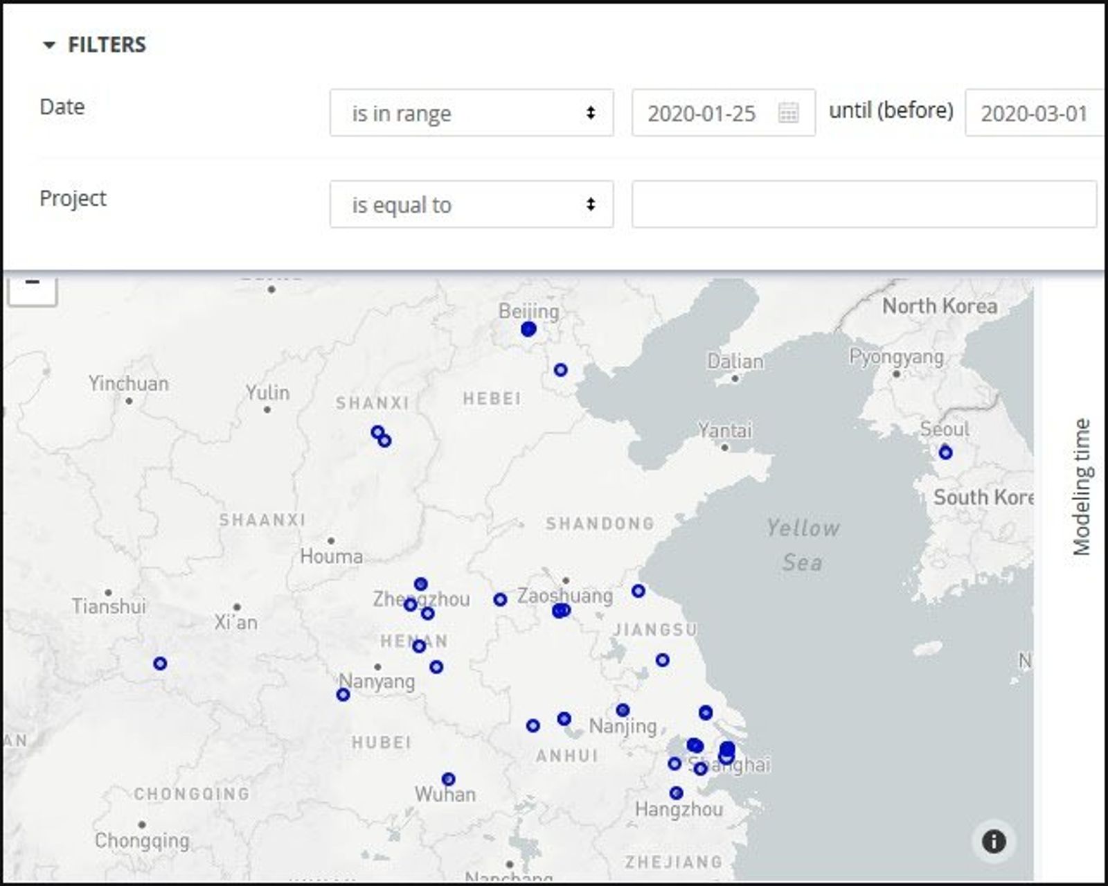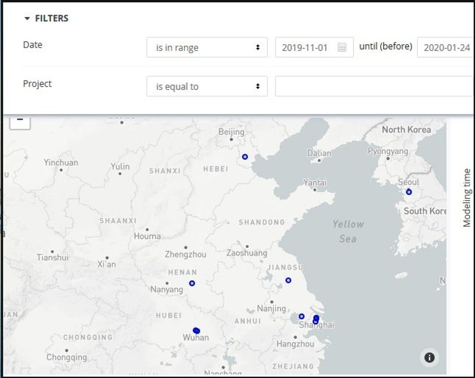 For a comparison, here is a map of where the company’s CAD users were working in November 2019, when the engineers were mostly based at their offices in China. Each dot represents a city with multiple users.