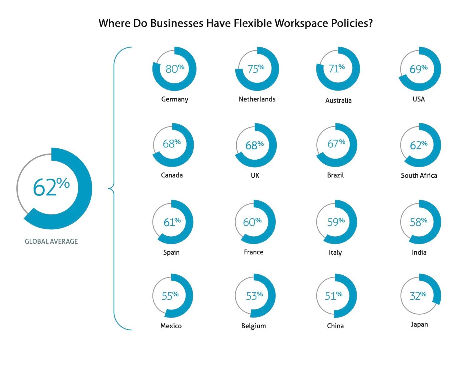 Interestingly enough, there is a wide range of adoption of flexible workspace policies in different countries, with Germany and the Netherlands being more open to the idea, and China and Japan being less so. Take a look at the chart below: