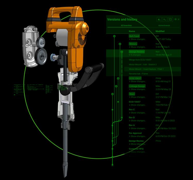Onshape's built-in Product Data Management (PDM) is a hassle-free way to centralize, store, search, and manage your data without the need for an expensive PDM system. Designed using a database architecture (instead of files), Onshape’s unique approach to PDM increases visibility while ensuring traceability of every action taken during the design process. This eliminates version control headaches while ensuring there's only one single-source of design truth without having to implement file check-in/check-out protocols.