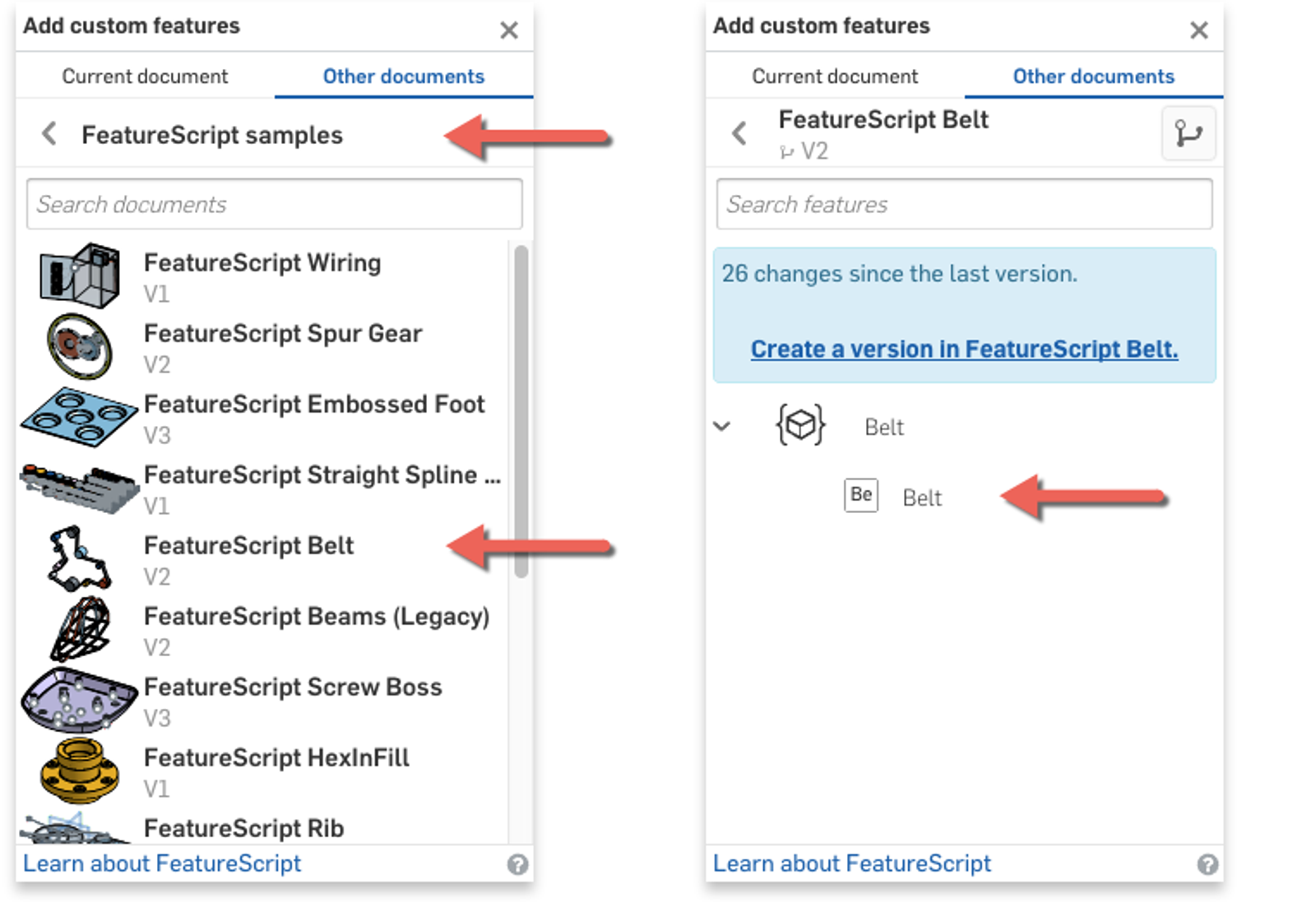 In the “Add custom features” dialog, select the “FeatureScript samples” filter, then “FeatureScript Belt” from the list and then the Belt feature itself. This will add the Belt feature icon to your toolbar and you’ll be able to use it in every Document.