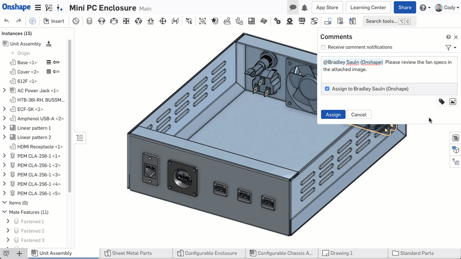 This can be useful in a number of ways. In the example above, an image of a spec sheet is added to the Comments dialogue with details regarding fans being used for the design. This could also be used to share screenshots with others involved in the project.