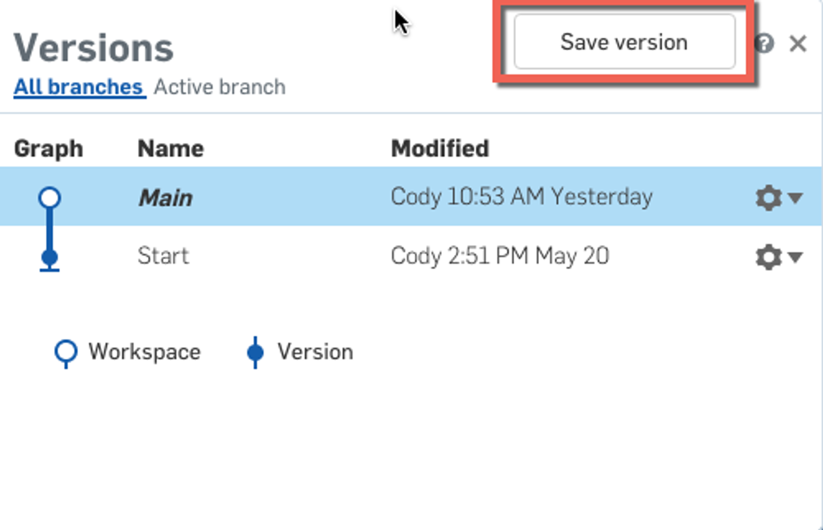 The first step in creating a branch is establishing a version. From the Version Manager, select “Save Version.” Here you can type in the name of the version and click “Save.”