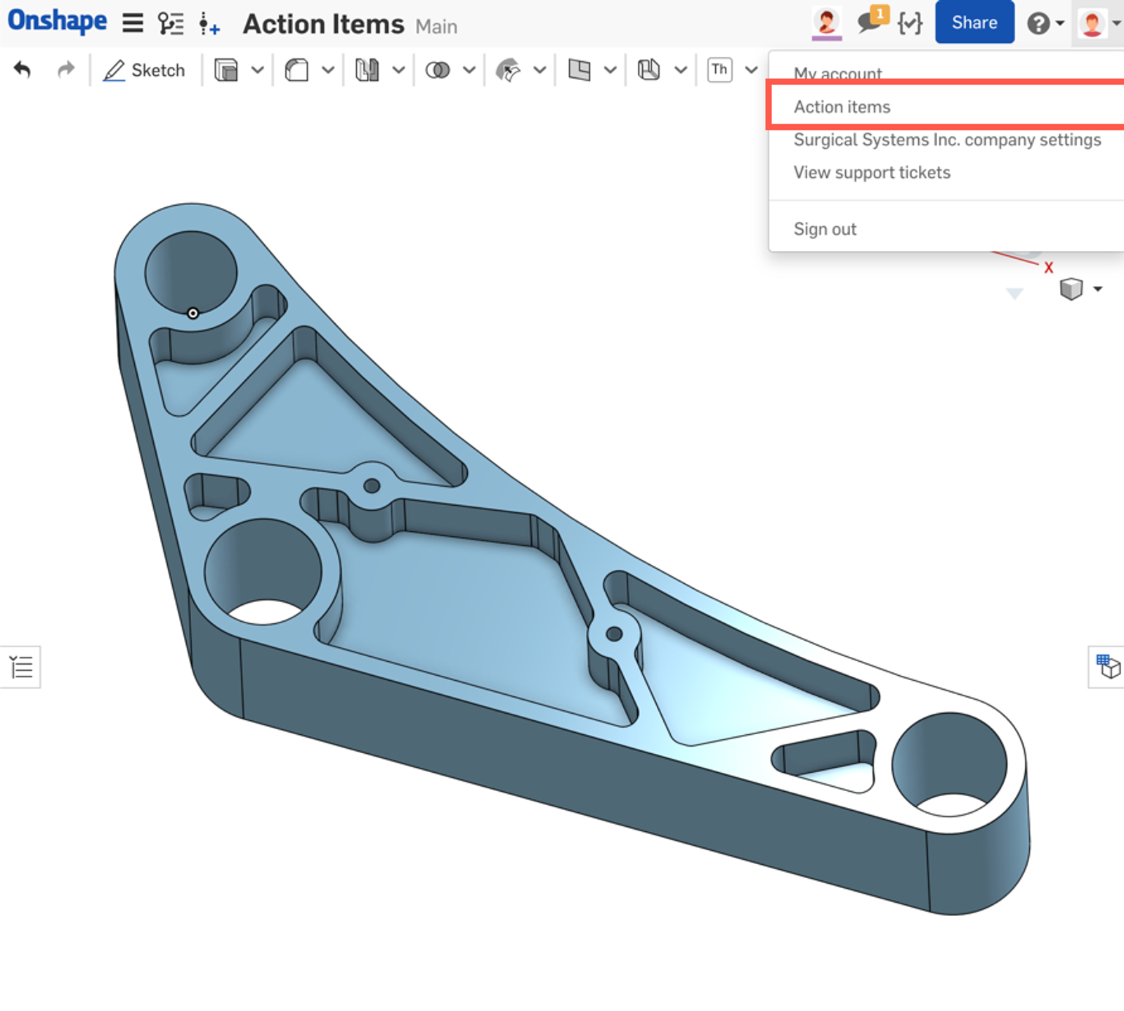 Note that you don’t have to be within an Onshape Document to view a full list of your Action Items. From the account dropdown menu on the top right-hand corner of the interface, you can also access your Action Items.