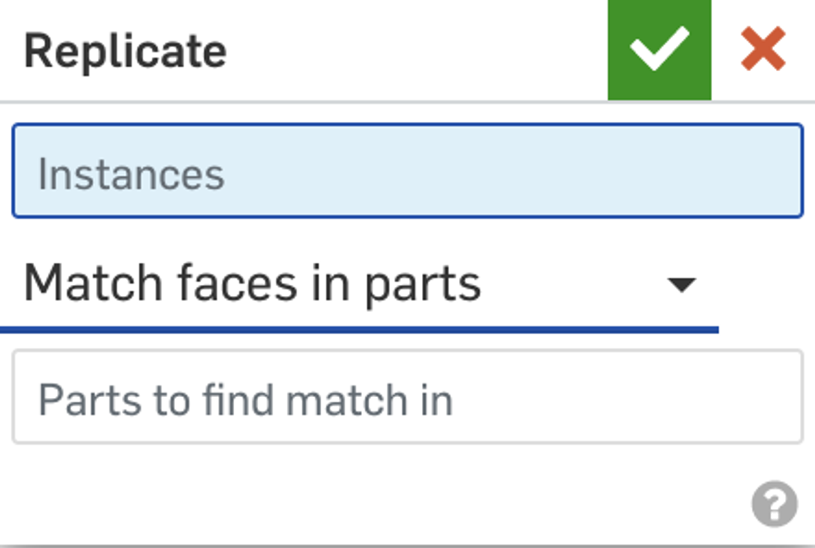 The inputs for the Replicate command will ask for an instance, or instances and a part, or a feature or face to match mates in.