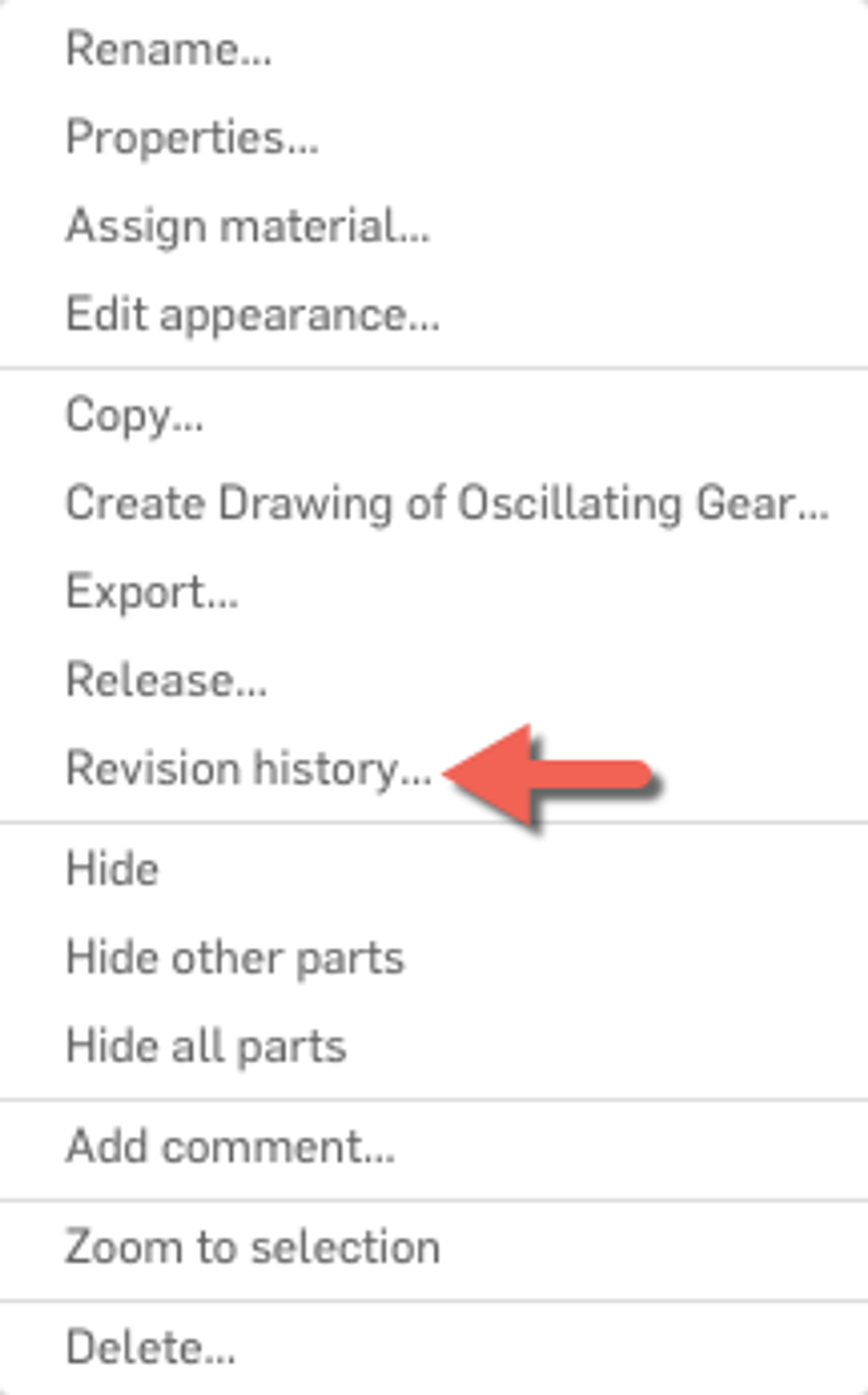 But what if you want to view the revision history for an individual part or assembly or drawing? Simply right-click on the released object and choose “Revision history.” This will bring up the complete history for whatever you selected.