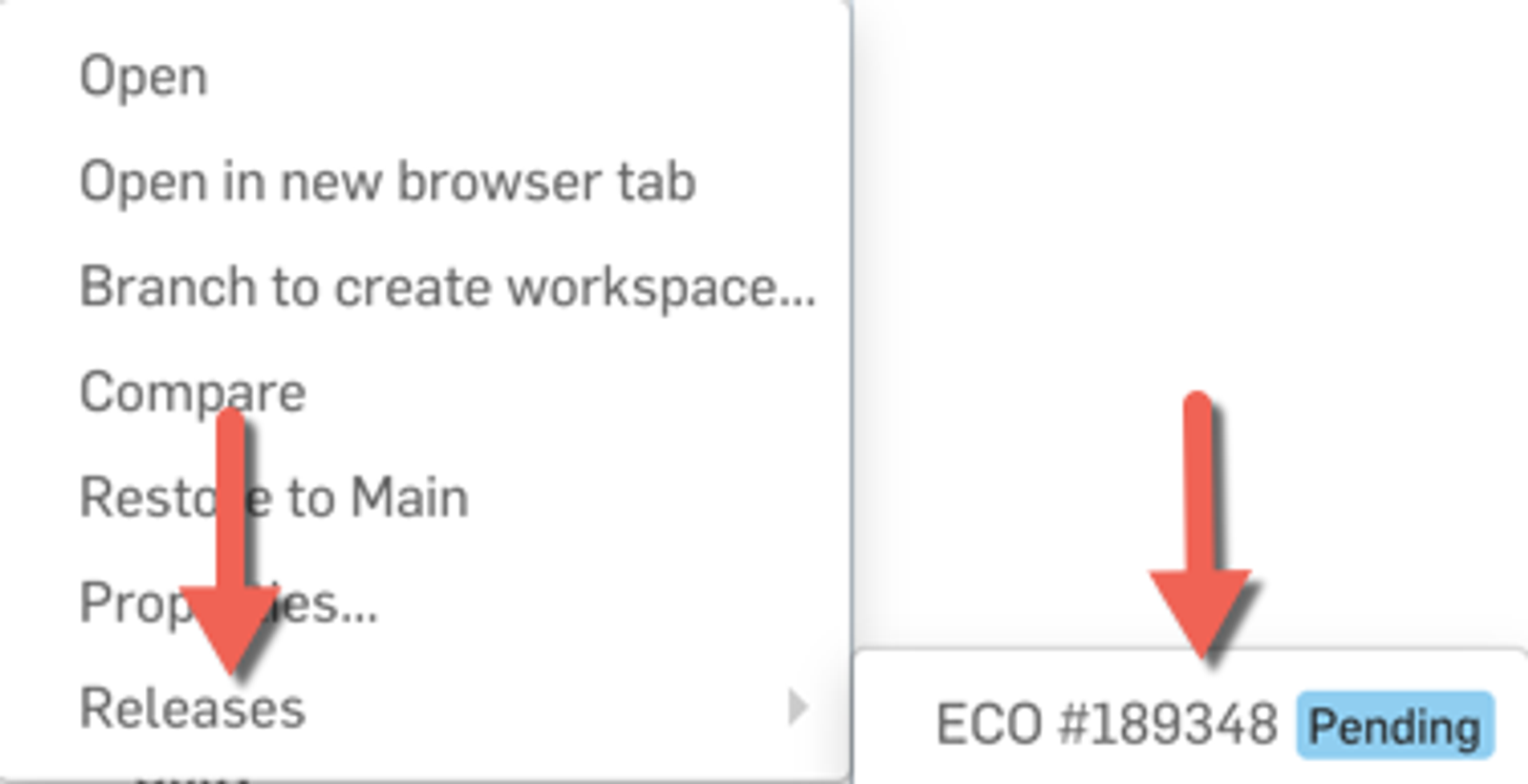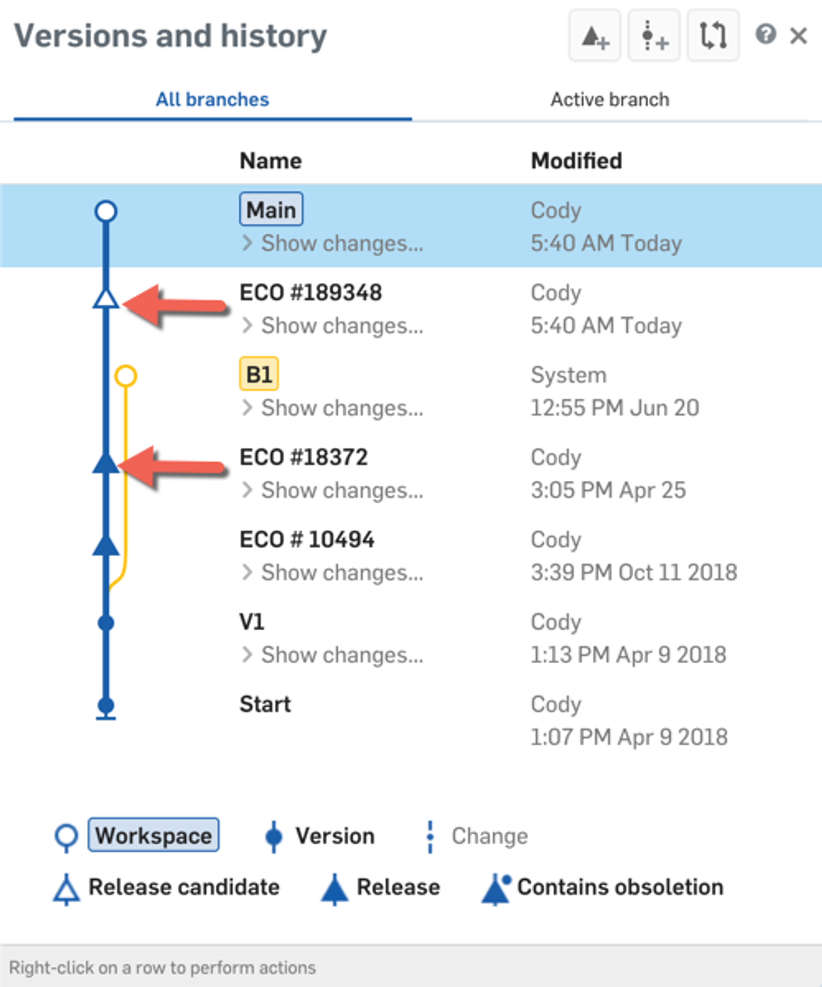 One of the easiest ways to view your release history is by clicking "Manage versions and history" in the top-left corner of Onshape. This will bring up the entire history for that Document, including any pending or approved releases. You can identify approved releases by their solid triangle in the “Versions and history” dialog. Any releases that are pending will have a hollow triangle.