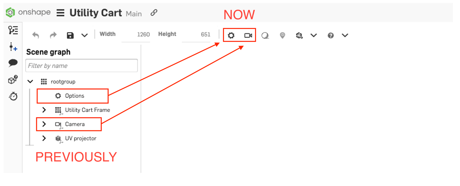 The "Options" and "Camera settings" nodes have been moved from the scene graph to the toolbar.