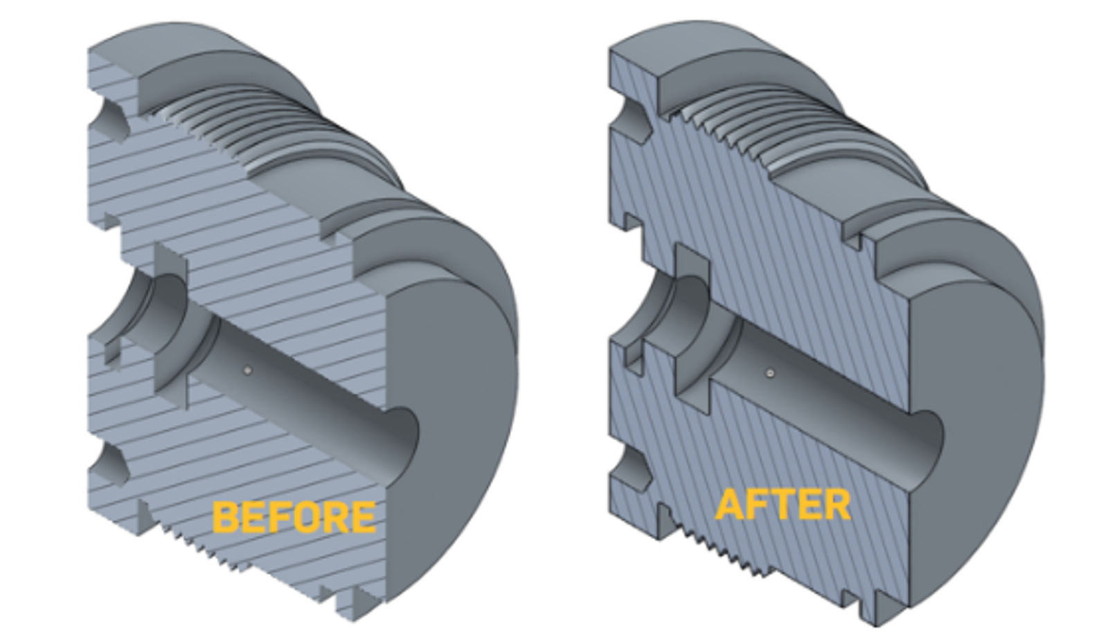 Section views in parts and assemblies now show the end caps. Showing these edges makes the section view more clear.