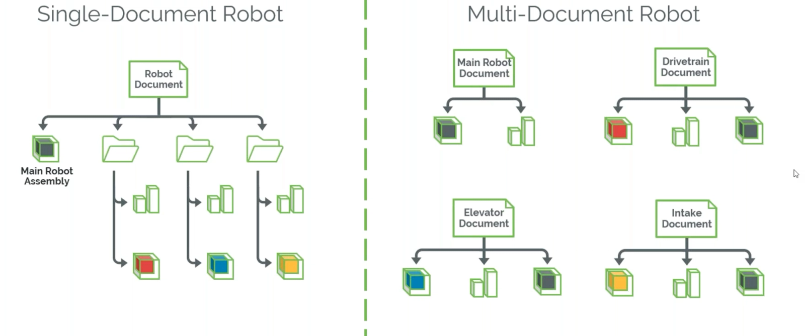 There are two ways to approach robot design: designing in a single document or splitting it up into multiple documents. Let’s go through the pros and cons of each so you can decide what will fit your team’s needs.