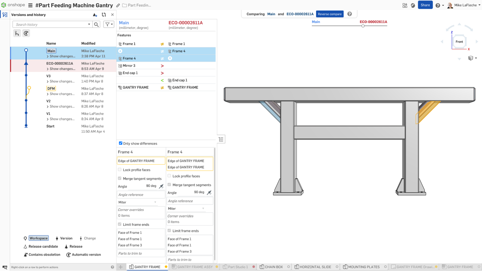 Need to see what your model looked like last week? Or how it's changed since the initial concept? Simply access the version graph and use the compare tool to visualize differences side by side.