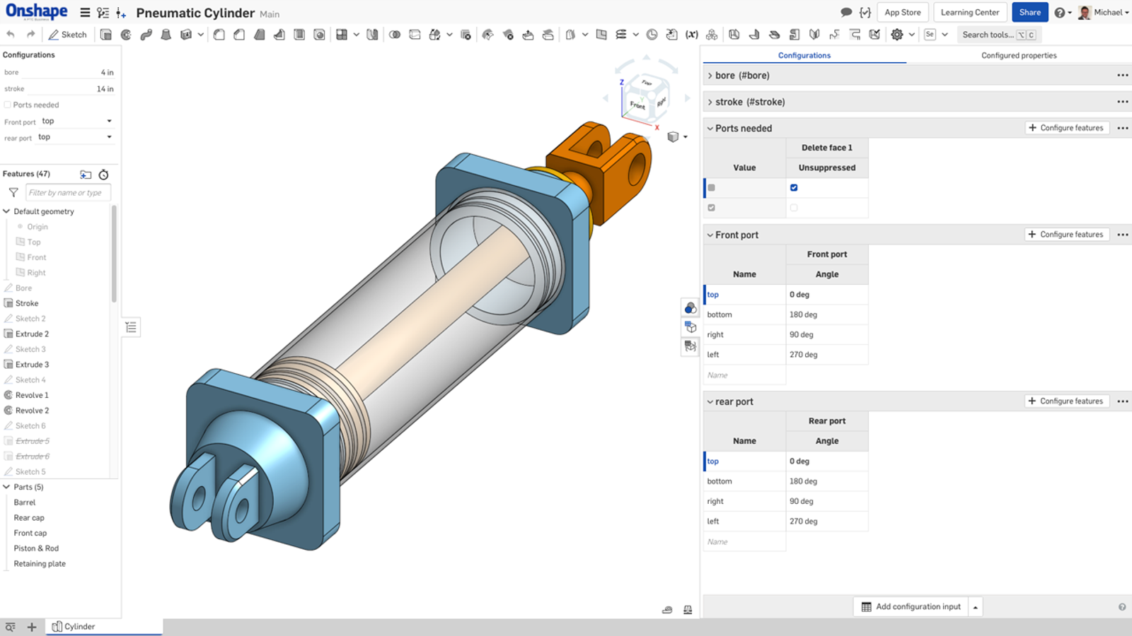 Onshape には、スケッチ、押し出し、回転、フィレット、シェル、ロフトなど、パラメトリックモデリングの中核要素がすべて揃っています。Onshape は、次のような多くの分野で根本的に優れたモデリング方法も備えています。