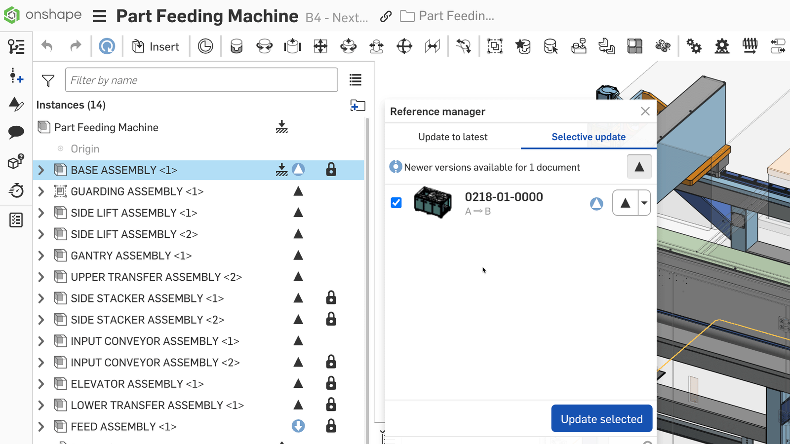 The designer, always in control while working in Onshape, must consciously choose to update the link by right-clicking the instance/feature and selecting "Update Linked Document". This controlled update process prevents unexpected changes from cascading through assemblies and gives teams control over when external modifications are incorporated.