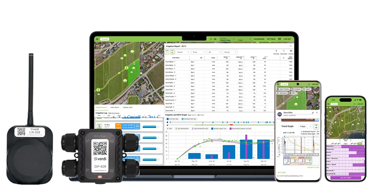 First, there’s the hardware. The underlying technology is based on a heavily integrated ultra-low-power design that enables simple installation and a significantly lower cost compared to existing automation systems today. The Verdi Micro-Block Controller is a smart device placed in each crop row to break the existing blocks into “micro-blocks” – determined by the company’s data-driven maps. Then, there is the Verdi Block Controller, another smart device used to bring a farm’s existing valves, pumps, and sensors online. Going digital allows growers to automate their most time-consuming tasks like creating data-driven schedules, looking for breaks, and keeping an accurate record of water. Farmers can make these decisions using Verdi’s software. The Verdi App streamlines and simplifies irrigation management from a laptop or mobile device. No more tedious, repetitive work that relies on instincts and handwritten notes.