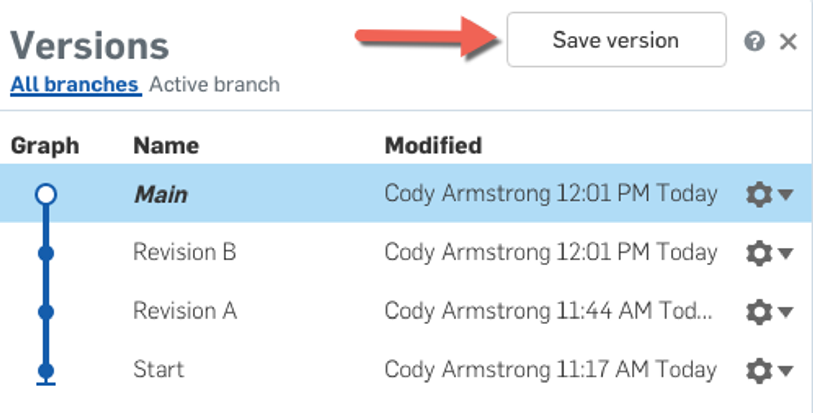 With Onshape, capturing major milestones in your designs is easy with Versions. To create a version, first select the Versions Manager from the top left corner of a Document and then click “Save version.”