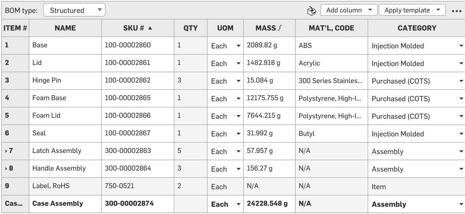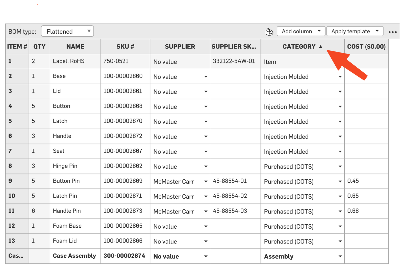 Shows costs, supplier, and the supplier part number and category. To easily count purchased COTS (commercial off-the-shelf) items, sort the category by double-clicking the BOM header.