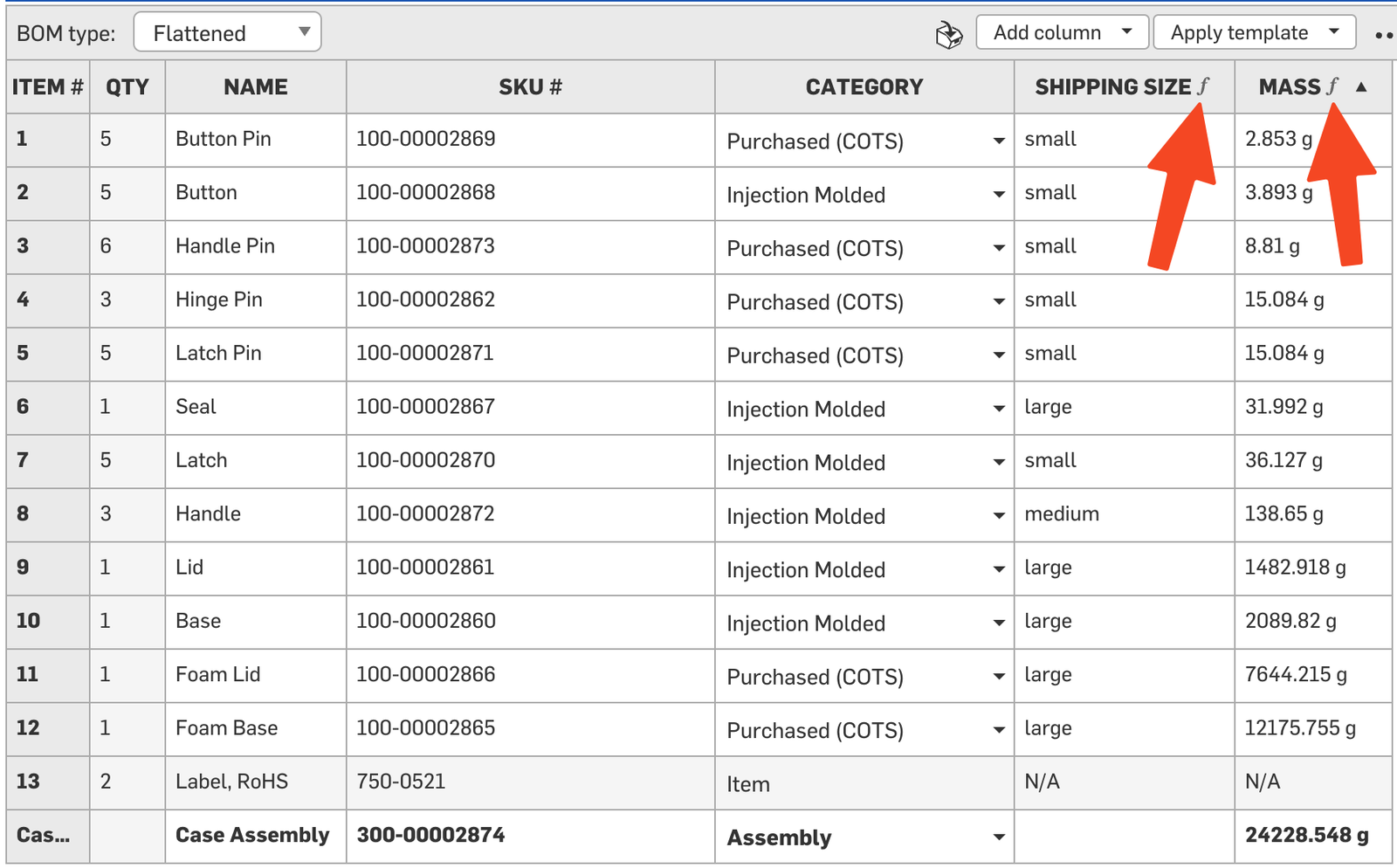 - Flattened BOM View: This view rolls up all parts into a single list with quantities, which is best for purchasing, quoting, and inventory management.