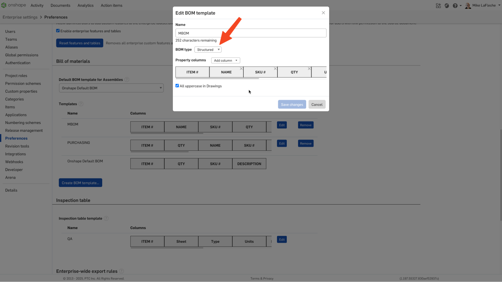 Standardizing the BOM layout ensures audit readiness and repeatable output across projects. Under your company preferences, there are options to set the default BOM template, edit existing BOM templates, or create new BOM templates. For each template, you can select its type (Structured or Flattened) and edit its presentation.