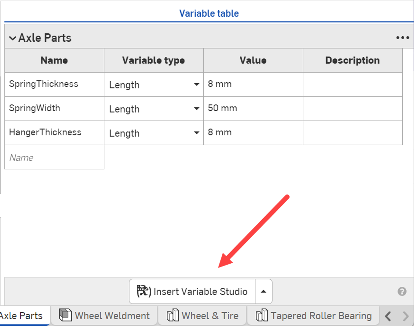 If you instead disable the Insert into all Part Studios and Assemblies checkbox, Onshape no longer links the Variable Studio variables to all Part Studios and Assemblies. Instead, you now must manually link the variables you want to reference in the relevant Part Studios or Assemblies. This is done by using the Insert Variable Studio button at the bottom of the Part Studio or Assembly’s Variable table panel: