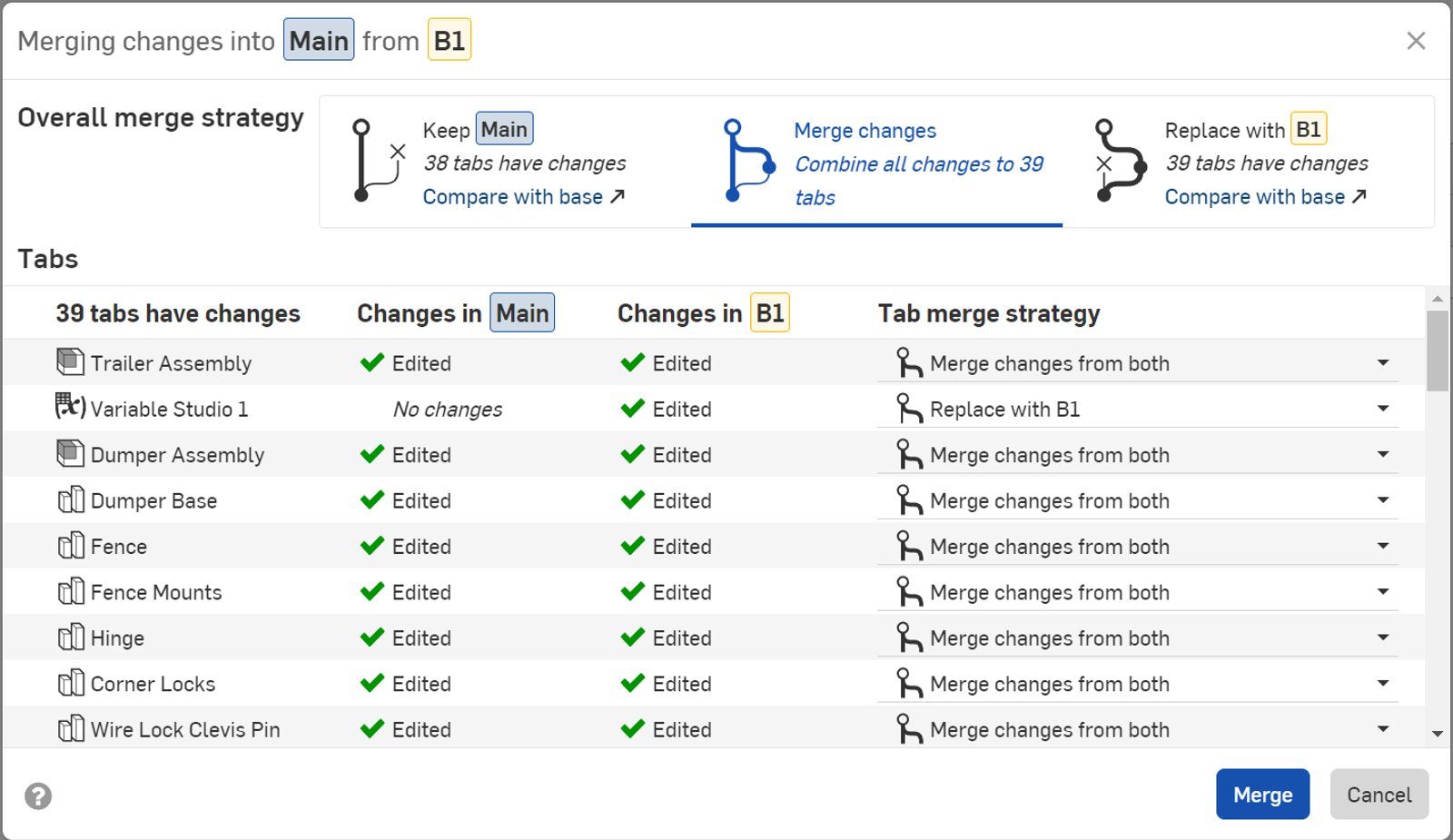 Making a change to any variable’s value automatically updates all Part Studios and Assemblies that use them. While this is convenient, it can cause challenges when you branch and merge.