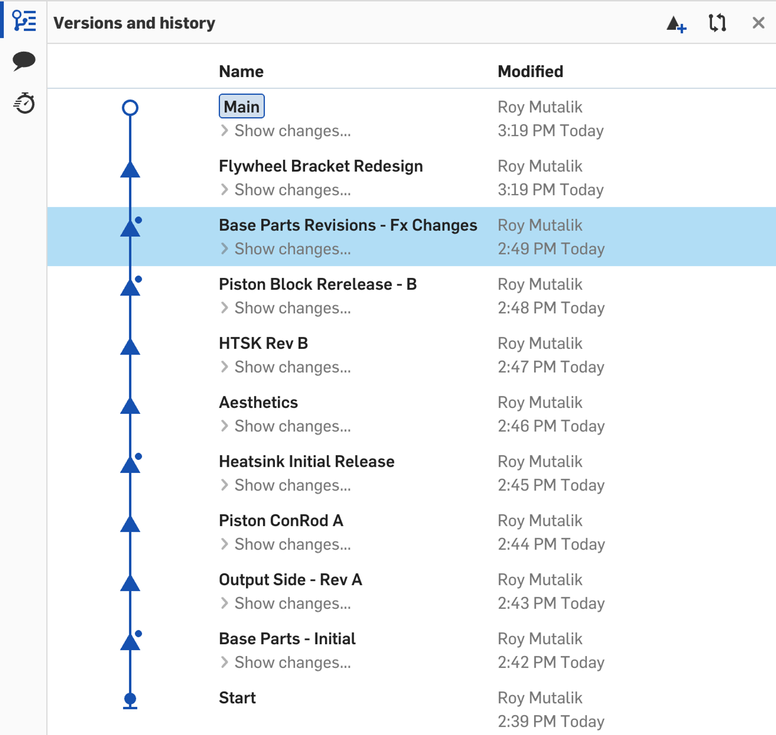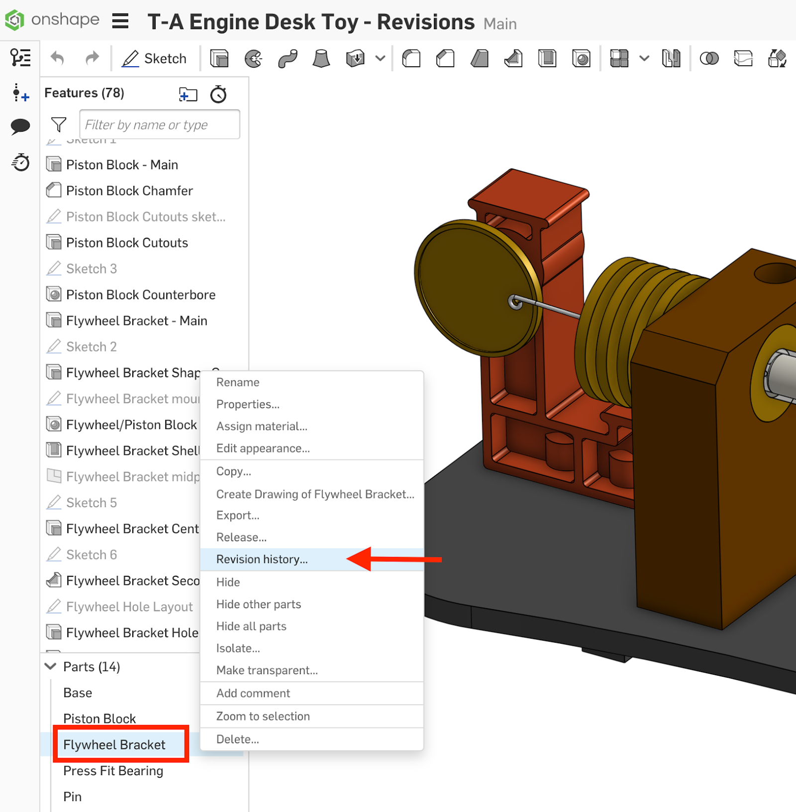 A preferred method to find a specific revision is to navigate directly to the revision history of a part. In the Part Studio, we’ll navigate to the Flywheel Bracket part in the Parts list.