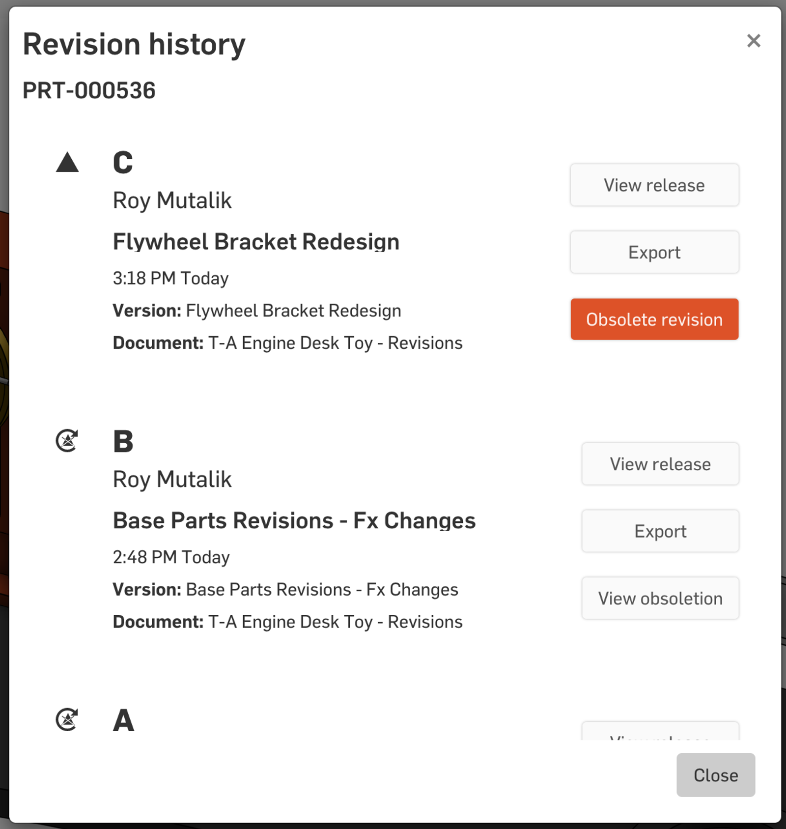 Here we can see the Flywheel Bracket actually has three revisions. The most recent revision, C, was approved in the “Flywheel Bracket Redesign” release candidate. The previous revision, B, was approved in “Base Parts Revisions- Fx Changes” candidate – something we didn’t recognize from just the release candidate name. Scrolling down in this dialog, we’d be able to see older revisions as well.