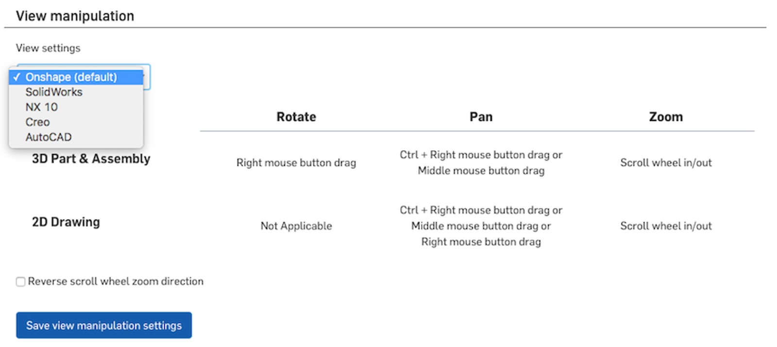 Here you will find options for “View manipulation.” You can set rotate, pan, and zoom settings to match SOLIDWORKS, NX 10, Creo, and AutoCAD. Simply choose your application from the list and click “Save view manipulation settings.”