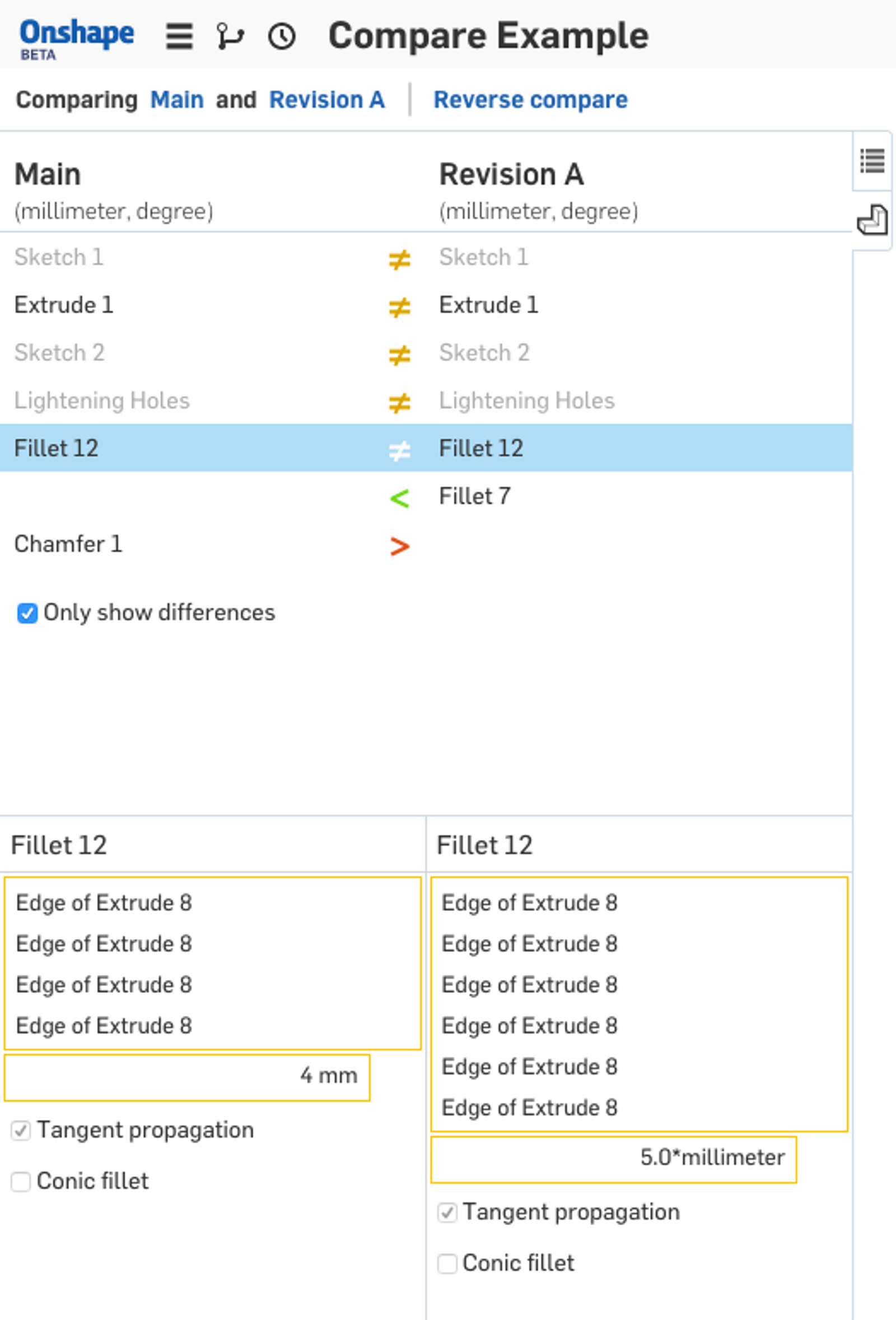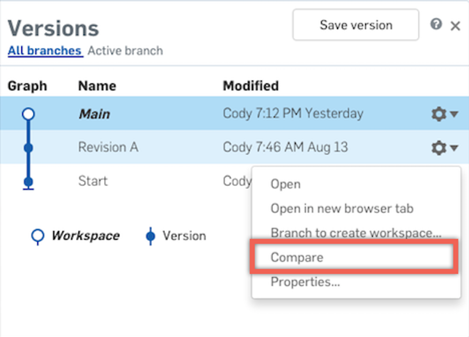 Compare is a great way to get both a list and a visual reference of all the changes between Versions, Workspaces, or even moments in History in a Part Studio. To use Compare, select the Compare command from the dropdown menu in the Versions Manager or History menu.