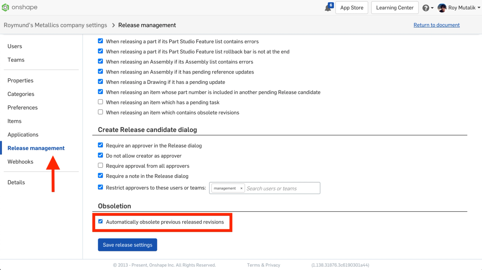The above process showed how to manually obsolete a single part on an as-needed basis. However, in some organizations any new release always supersedes the previous one. When this is the case, there is an option in the Release Management settings to automatically obsolete the previous revisions upon the approval of a newer one.
