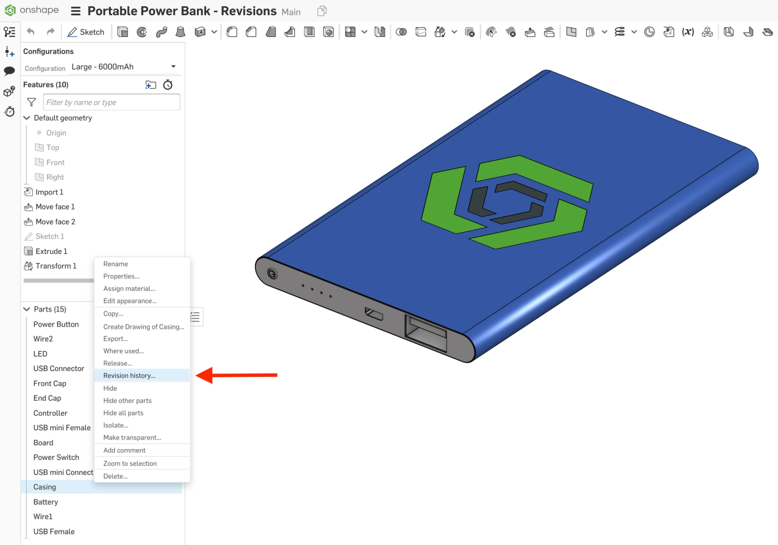 - Navigate to the element you wish to obsolete. If it’s a part, right-click on it from the parts list in the Part Studio. If it’s an assembly, right-click the assembly tab. Select “Revision History”.