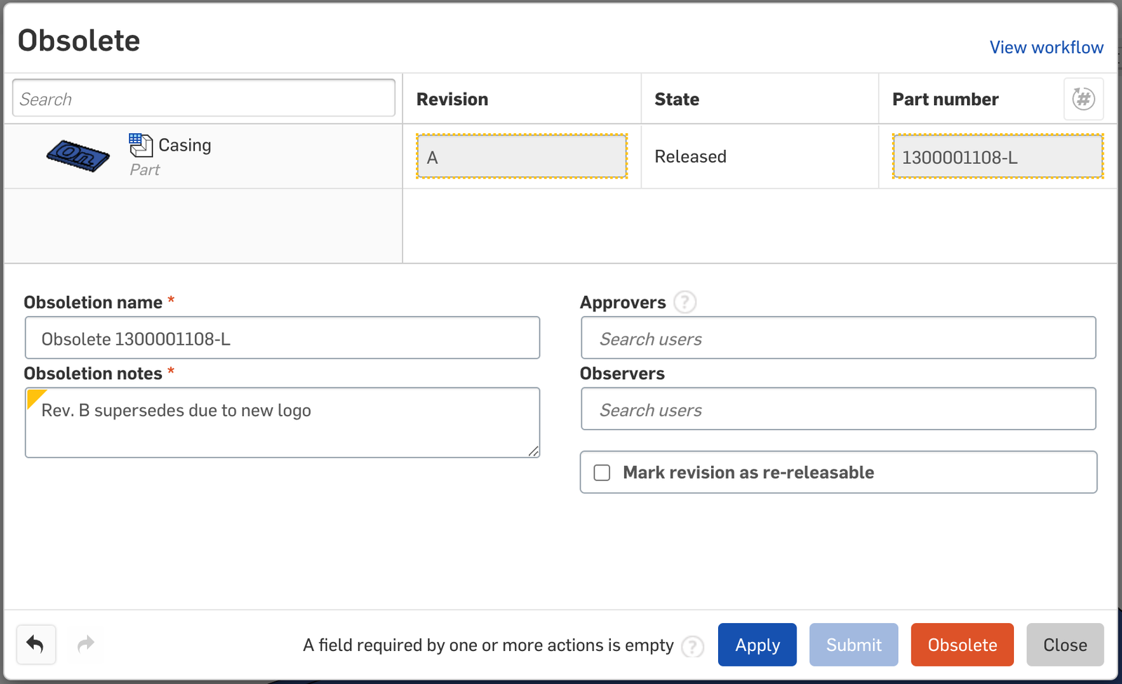 Finally, if you are using Onshape Enterprise, your Obsoletion workflows are fully configurable just like a Release workflow. This allows you the flexibility of multiple approvers, additional metadata fields, and much more.